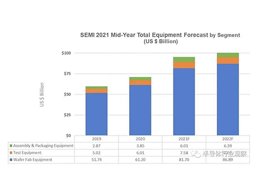 晶圆厂设备部门,包括晶圆加工、晶圆厂设施和掩模/掩模版设备,预计到2021 年将飙升 34% 至817 亿美元的行业新纪录,2022 年将增长 6% 至超过860 亿美元。