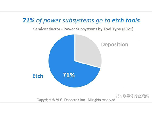 有趣的是,按工具类型对电源子系统的分析表明,绝大多数电源子系统 (70%) 用于蚀刻工具,只有 30% 用于沉积工具。这种差异可以通过以下事实来解释:更精细的蚀刻工艺可能需要每个工具使用多个 RF 功率解决方案。相比之下,沉积并不总是使用等离子体能源,例如,在热沉积工艺中。