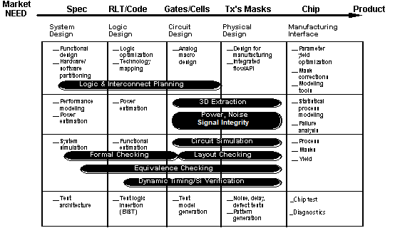 下面是一张芯片设计公司的项目基本流程图,我们可以清楚的看到,从市场需求出发,到产品tape out进行制造,每一个环节都标注对测试的相关考虑。从测试架构、测试模式产生,到各种噪声/延迟/失效模式综合,进而产生测试pattern,以及最后进行成品测试,对测试数据进行分析,从而分析失效模式,验证研发。