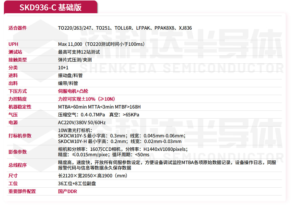 SKD936/SKD936-C转塔式测试分选机用于更多功能分选需求,具有36个工站,可灵活选择供料方式,支持多种出料方式,灵活搭配,满足客户有更多工位组合需求;同时兼顾较大封装尺寸产品测试分选的要求(TO220 / 263/247、TO251、TOLL6R、LFPAK、PPAK8X8、XJ836等)。