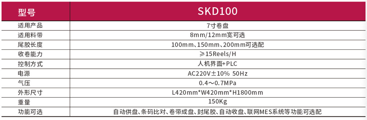 SKD100自动换盘机属于反向卷取的自动换盘机,主要功能是联接测试分选机,实现自动供盘、卷带成盘、封尾胶、自动收盘等功能。
