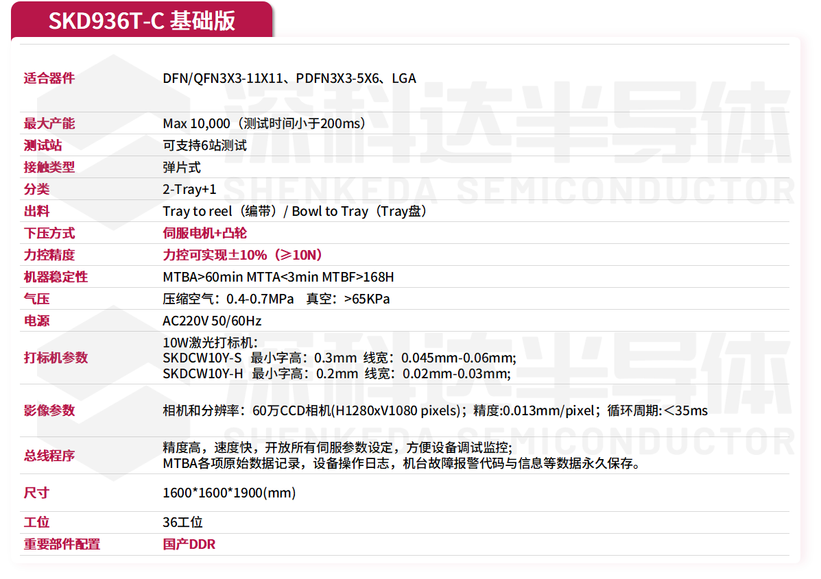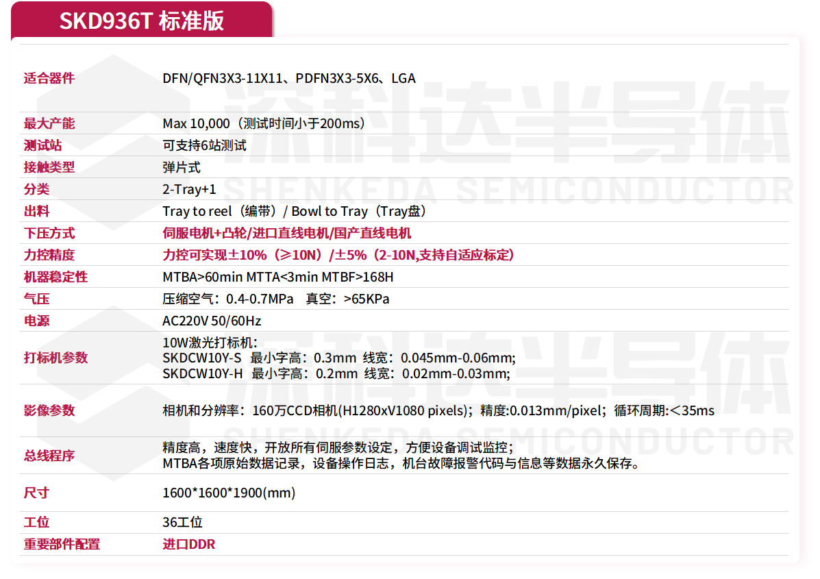 SKD936T转塔式分选机用于分立器件、IC器件等的Tray盘进出料、外观检测、编带、具有高速测试打标编带能力,采用高精度DDR。整合打标系统和影像系统,为客户带来高质量的产品输出。