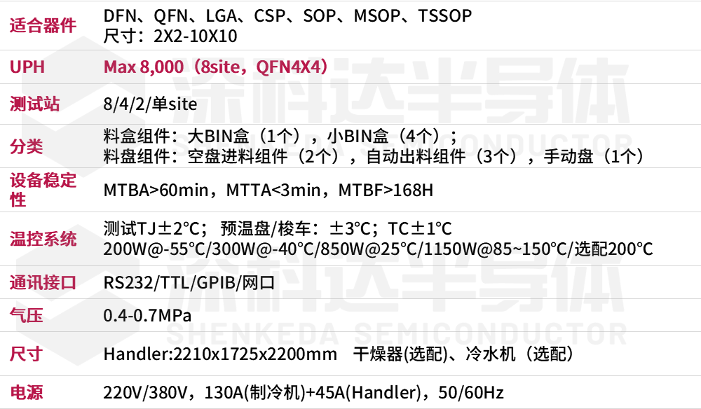 SKD308TB 三温平移式测试分选机适用于DFN、QFN、LGA、CSP、SOP、MSOP、TSSOP等产品规格在2X2-10X10的低温/常温/高温测试分选、分类需求,整合影像系统,为客户带来高质量的产品输出。