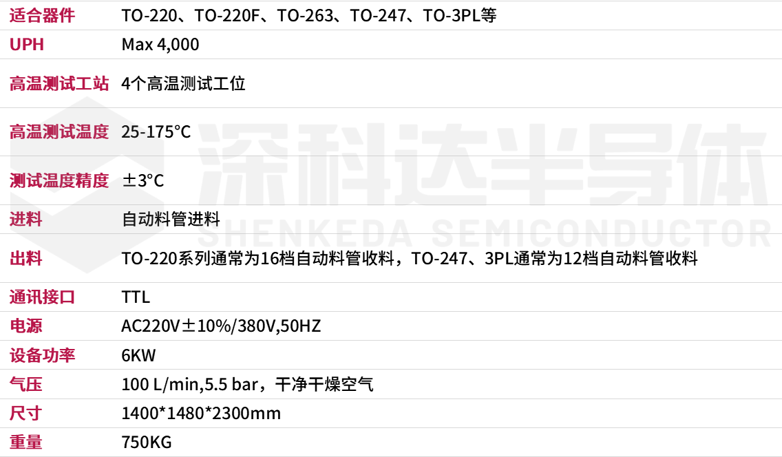SKD811H直背重力式分选机是一款针对TO系列功率器件产品而设计的全自动分选机,具有多个常温/高温串联测试工位,将产品高温加热、高温测试(或者常温测试)、激光打标、毛刷除尘、2D视觉检测等功能于一体。