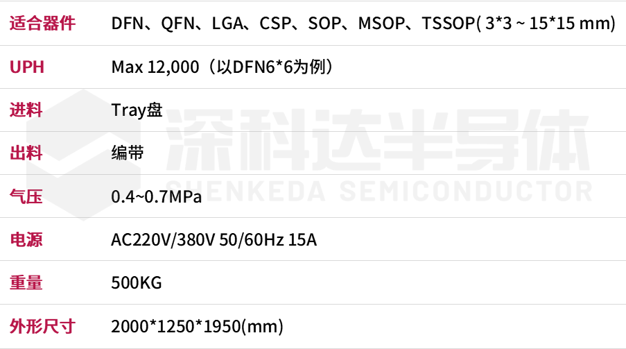 SKD610是一款平移式Tray to Reel 并带AOI检测的编带一体机,采用Tray盘上料方式供料和自动变距吸嘴装置取料编带,并配备多工位影像系统以保证产品编带的高良率,可同时兼容不同封装尺寸产品编带的要求【DFN、QFN、LGA、CSP、SOP、MSOP、TSSOP ( 3*3 ~ 15*15 mm)】。