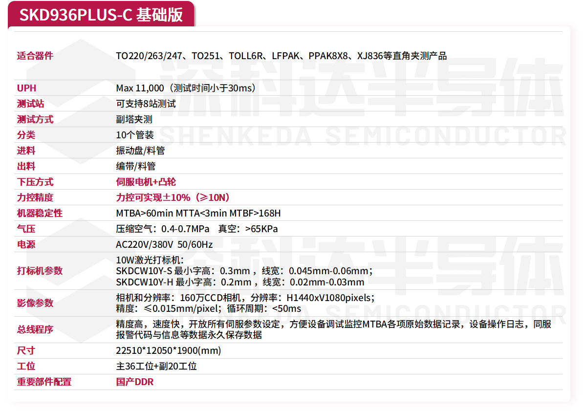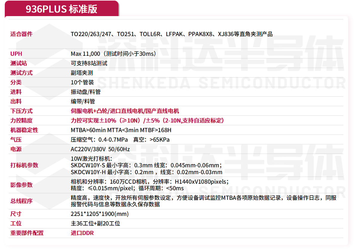 SKD936PLUS/SKD936PLUS-C转塔式分选机用于多功能测试分选需求,满足更多工站的选择,灵活的供料方式搭配,可支持多种出料方式灵活配置,亦可满足客户的更多分类及容量需求;同时兼顾较大尺寸的封装产品(TO220/263/247、TO251、TOLL6R、LFPAK、PPAK8X8、XJ836等直角夹测产品)。